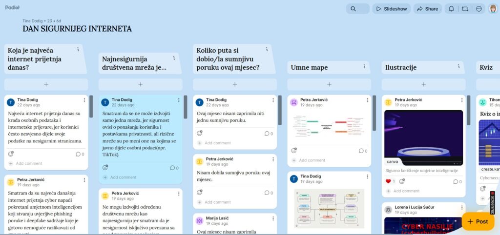 Učenici 3.c razreda Gimnazije dr. Mate Ujevića obilježili su Dan sigurnijeg interneta, izradili su padlet zid s umnim mapama i digitalnim sadržajima o lažnim porukama, kako ih otkriti, sigurnoj zaporci, fishing porukama, cyber nasilju, postavili svojim kolegama pitanja vezana za sigurniji internet, izradili zanimljiv kviz.