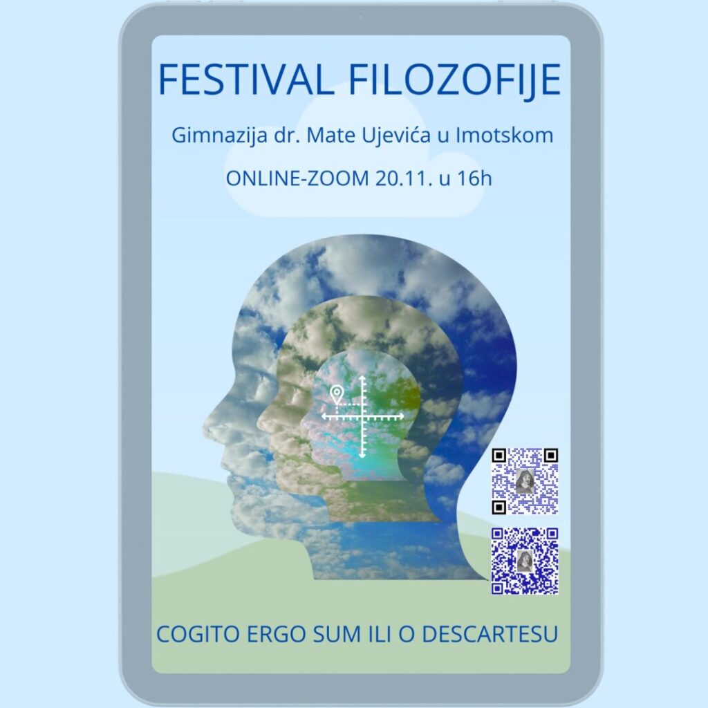 Povodom Svjetskog dana filozofije koji se obilježava svakog trećeg četvrtka u studenom od 2002. godine na inicijativu UNESCOa, ovog četvrtka 20. studenog održat će se Festival filozofije (online) pod nazivom Cogito ergo sum ili o Descartesu kao hommage velikom francuskom filozofu, fizičaru i matematičaru René Descartesu iz 17. stoljeća. Descartesa se smatra utemeljiteljem analitičke geometrije, tvorcem koordinatnog sustava, zakona loma zraka svjetlosti itd., a zadaću i smisao znanosti i filozofije Descartes je vidio u jačanju i osnaživanju prirodnog svjetla uma. Predavanja posvećena mnoštvu zanimljivih, aktualnih tema poput poimanja duha i tijela, metodičkoj sumnji, metodi spoznavanja istine, Boga, Descartesovom doprinosu razvoju znanosti, započet će u četvrtak u 16h preko platforme Zoom.
