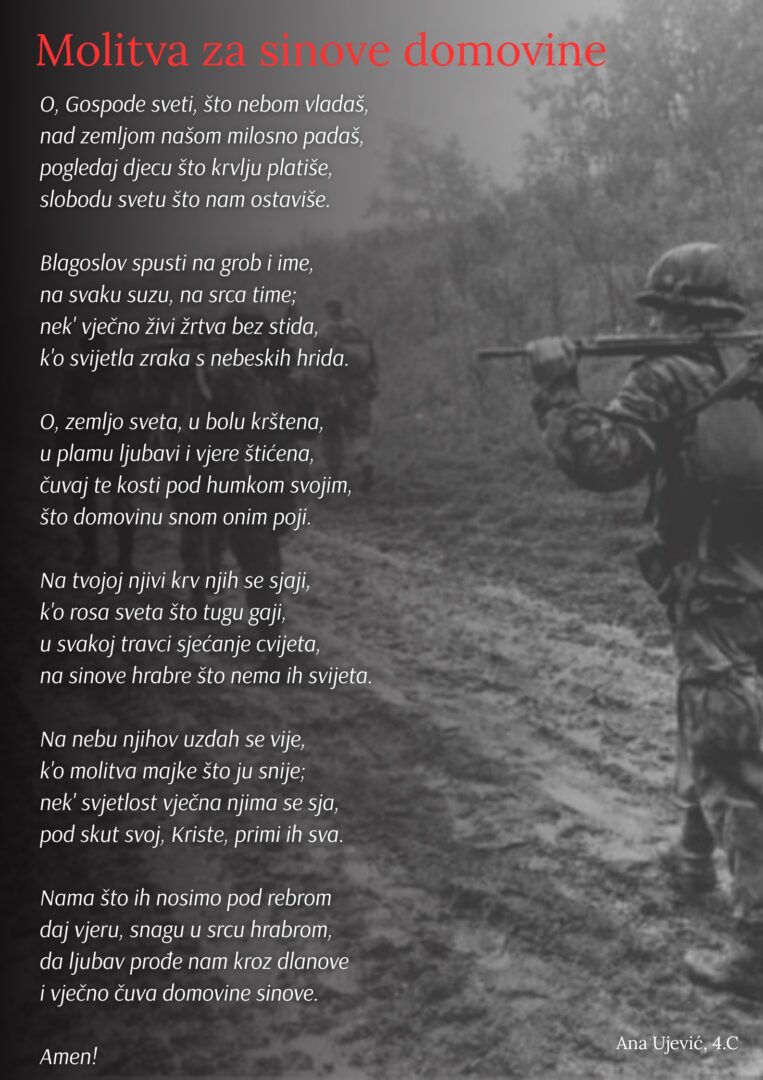 U sklopu školskoga projekta Čuvajmo hrvatsku baštinu – Putevima hrvatskih vladara i hrvatske kulturne baštine prof. hrvatskoga i njemačkoga jezika Dine Šućur te povodom obilježavanja Dana sjećanja na žrtve Domovinskog rata i Dana sjećanja na žrtvu Vukovara i Škabrnje 2025. učenici 4.c razreda odali su počast herojima i žrtvama Domovinskog rata, Vukovara i Škabrnje prigodnim stihovima, većinom haiku-poezije. Njihove radove možete pogledati i pročitati na sljedećoj poveznici: